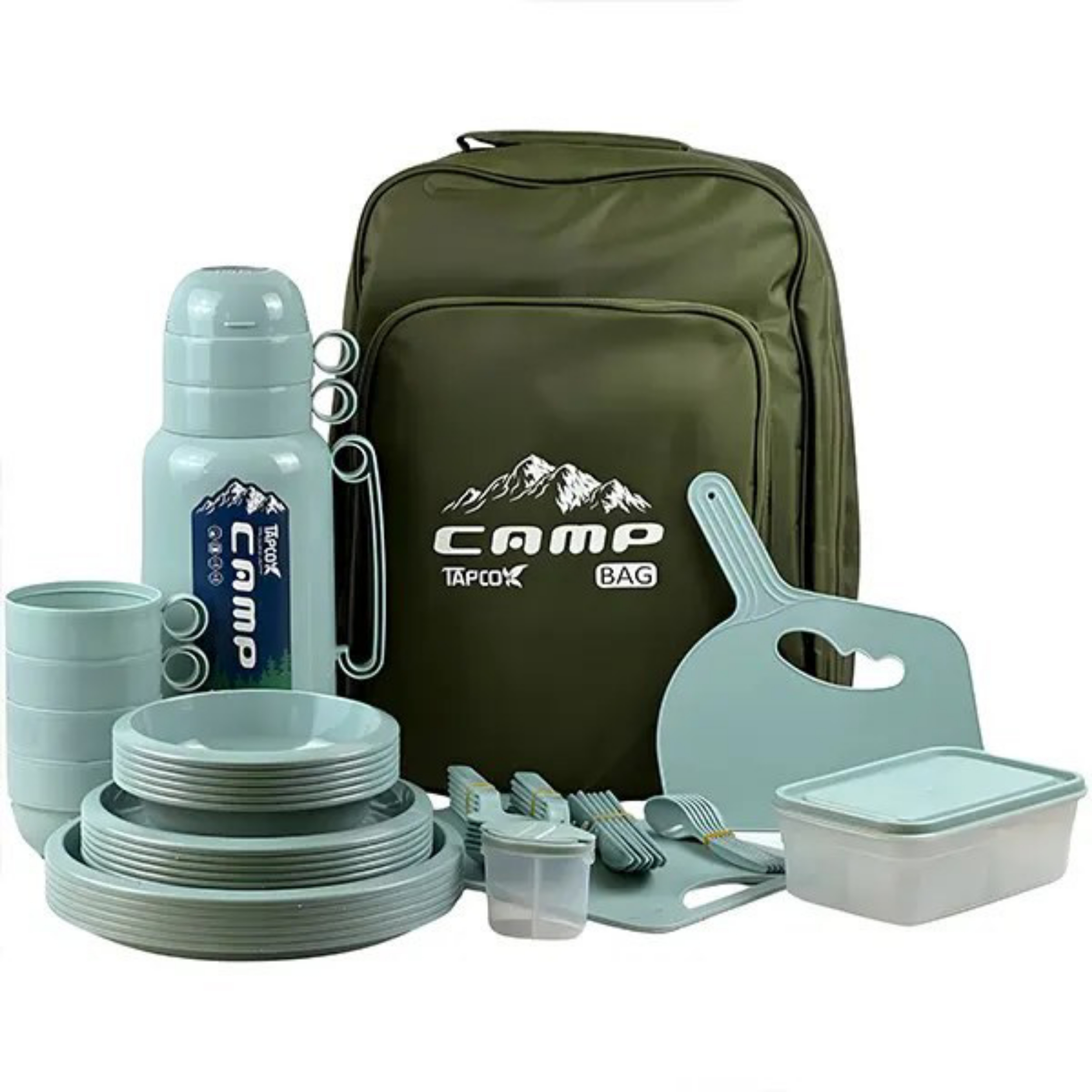 محتویات داخل ساک شامل : یک عدد فلاسک 1.7 لیتری ، یک عدد باکس که درون خود ظروف کوچکتری برای استفاده مجزا و یا تقسیم فضای داخلی ظرف را دارد ، 6 عدد بشقاب ، 6 عدد کاسه ، 6 عدد پیش دستی ، 6 عدد قاشق غذاخوری ، 6 عدد چنگال ، 6 عدد کارد میوه خوری ، 6 عدد قاشق چای خوری ، 6 عدد لیوان به همراه نمکدان دوقلو ، بادبزن و تخته گوشت می باشد